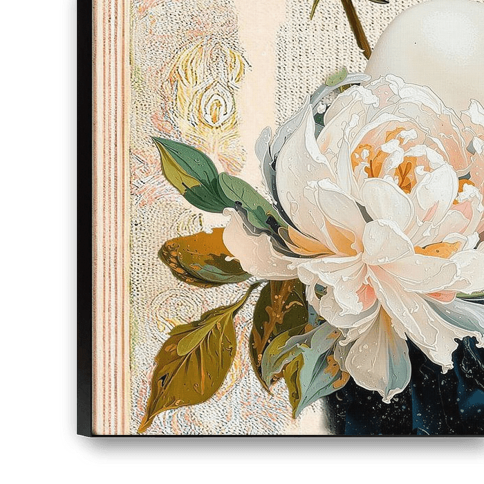 Het kleurenpalet is rijk en energiek, met een basis van levendig geel, koningsblauw en turquoise, gecombineerd met pioenrozen in pasteltinten. De combinatie straalt optimisme en artistieke vrijheid uit.