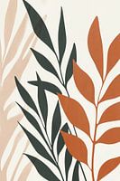Deze minimalistische botanische illustratie combineert rust en elegantie met aardse tinten en gestileerde bladvormen. Donkergroene, terracotta en beige bladeren contrasteren harmonieus tegen een lichte achtergrond. De abstracte, maar natuurlijke vormen roepen sereniteit en natuurverbondenheid op. Overlappende elementen en variërende bladgroottes creëren diepte en interesse. Het werk belichaamt boho-chic esthetiek, waarbij organische vormen en minimalisme samenkomen in een tijdloos, kalmerend en visueel aantrekkelijk ontwerp.