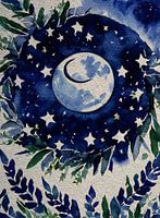 Bohemian Vintage aquarel van de maan omringd door bloemenkransen in een diep donkere nacht, met een donkerblauw, paarse hemel. De maan is omringd door sterren en bloemen.