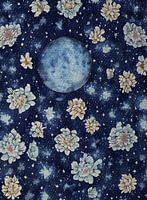 Bohemian Vintage aquarel van de maan omringd door bloemenkransen in een diep donkere nacht, met een donkerblauw, paarse hemel. De maan is omringd door sterren en bloemen.