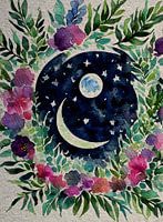 Bohemian Vintage aquarel van de maan omringd door bloemenkransen in een diep donkere nacht, met een donkerblauw, paarse hemel. De maan is omringd door sterren en bloemen.