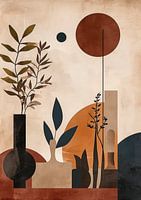 Je ziet een boho schilderij in de kleuren beige, bruin, rood en zwart.