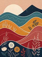 Dit levendige en gestileerde kunstwerk toont een sereen landschap met glooiende heuvels, een grote zon die erachter ondergaat en een bergtop in de verte. De compositie bestaat uit verschillende lagen land in warme, aardse tinten rood, oranje en blauw, elk versierd met witte contouren van botanische elementen zoals bladeren, bloemen en…