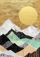 Ontdek deze moderne boho-illustratie van een berglandschap met de zon aan de hemel. Het gouden folieblokeffect geeft het platte vectorontwerp een luxe uitstraling. Geometrische vormen, minimalistische elementen en zachte lijnen kenmerken de stijl.