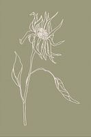 Line art witte bloem op salie groene achtergrond. Bloemige semi abstracte minimalistische kunst met een beetje retro vibes. Perfect voor een woonkamer, slaapkamer, wachtkamer, werkkamer, tuin of hal. Bohemian, Zen, Scandinavisch, Basic, New Rural, Romantic, Japandi woonstijl.