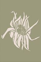 Line art witte bloem op salie groene achtergrond. Bloemige semi abstracte minimalistische kunst met een beetje retro vibes. Perfect voor een woonkamer, slaapkamer, wachtkamer, werkkamer, tuin of hal. Bohemian, Zen, Scandinavisch, Basic, New Rural, Romantic, Japandi woonstijl.