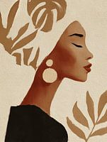 Een warm en minimalistisch vrouwenportret in profiel, uitgevoerd in zachte zandtinten en rijke terracotta. De gesloten ogen en rustige houding geven het werk een serene, bijna meditatieve sfeer. De grafische bladeren op de achtergrond en de grote ronde statement oorbellen zorgen voor een moderne, bohemian chic uitstraling. Het geheel…