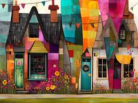 Een rij dorpswinkels in Boho-stijl. Vrolijke, kleurrijke patchwork gebouwen.