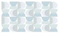 Een abstract schilderij van organische geometrische regenboogvormen in neutraal grijs.