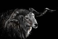 Bok met hoorns en zwarte achtergrond. De prchtige hoorns van de bok zijn zichtbaar over de gehele breedte van de foto. De bok staar er krachtig op. Een prachtig dieren portret van de zijkant genomen.