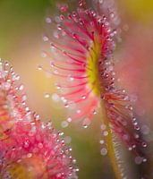 Macrofoto van zonnedauw, waarbij de vloeistof bolletjes mooie bokeh ringen creëren.