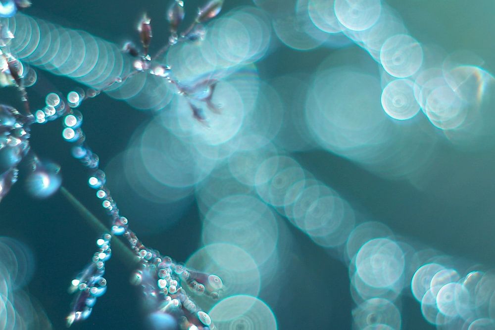Een takje met druppels geeft met tegenlicht een geweldig sprankelend beeld.
