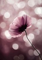 Deze afbeelding vangt de essentie van verfijnde schoonheid en subtiele verfijning door de delicate klaproos in haar fragiele glorie vast te leggen. De bloemensteel, dun en doorschijnend als een bijna onzichtbare draad, lijkt bijna gewichtloos terwijl deze zich uitstrekt in een verfijnde lijn. Het zachte bokeh-effect op de achtergrond…