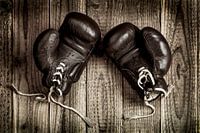 oude leren bokshandschoenen op een rustieke houten achtergrond.