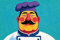 Bold Colors in the Kitchen - Dit is een chef schilderij van een vrolijke kok met een paarse koksmuts en rode wangen, die een glimlach laat zien tegen een heldere turquoise achtergrond.