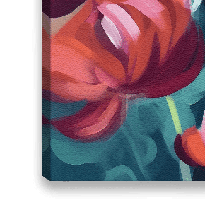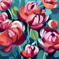 Figuratieve abstractie met kleurrijke tulpen in roze, oranje en groen tinten.