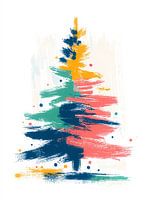 Dit abstracte kunstwerk toont een speelse en levendige kerstboom, gecreëerd met brede penseelstreken in heldere kleuren. De boom is opgebouwd uit vegen in oranje, groen, blauw en roze, met kleine kleurrijke stippen die de boom versieren, waardoor het een moderne en energieke uitstraling krijgt. De frisse kleuren stralen een gevoel van vreugde en feestelijkheid uit, perfect voor de kerstperiode. De achtergrond is wit, waardoor de felle tinten van de boom volledig tot hun recht komen en de compositie een minimalistische, frisse uitstraling heeft. De abstracte stijl doet de traditionele kerstboom herleven op een gedurfde en moderne manier, waardoor het kunstwerk zowel klassiek als hedendaags aanvoelt. Het werk ademt een speelse energie en een gevoel van vrolijkheid, ideaal voor een frisse, kleurrijke kerstdecoratie.