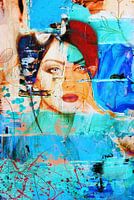 Abstracte collage in felle kleuren,portret van een vrouw in voornamelijk rood,blauw en turquoise tinten. Mixed media van papier,foto,canvas en verf