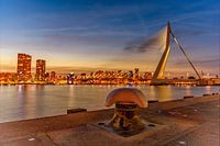 Bolderclose-up met cityscape van Rotterdam en de Erasmusbrug op de achtergrond. Foto die bij het blauwe uur wordt genomen dat mooie gouden en blauwe kleuren geeft. Vanwege de framing zijn er mooie bokeh op de achtergrond.