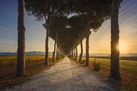 Bolgheri met pijnbomen omzoomde weg en wijngaarden bij zonsopgang. Castagneto Carducci, Maremma regio Toscane, Italië, Europa.