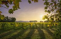Bolgheri wijngaard, en pijnbomen groep bij zonsopgang. Plataanbladeren als frame, herfstseizoen. Landschap in Alta Maremma, regio Toscane, Italië, Europa.