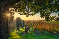 Bolgheri wijngaarden en olijfbomen bij zonsondergang.