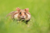 Wilde hamster, korenwolf, met bolle wangen in het groene gras