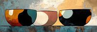 Bollen - Dit stilleven schilderij toont drie abstracte, geometrisch gevormde bollen op een rustieke, texturele achtergrond, waarbij elk verschillende aardetinten en accenten heeft zoals oranje, zwart, wit en turquoise.