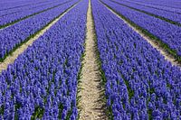 Foto van een paars bollenveld met rijen hyacinten in de de lente in de Bollenstreek. De bloemen op de uitgestrekte velden zijn in het voorjaar prachtig van kleur.