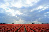 Bollenveld met rode tulpen en een mooie lucht met zonnestralen. Foto van deze bloemen is in het voorjaar gemaakt bij Dirksland op Goeree-Overflakkee. De landschappen op dit eiland zijn uitgestrekt, in de lente staan er veel bollenvelden in bloei.