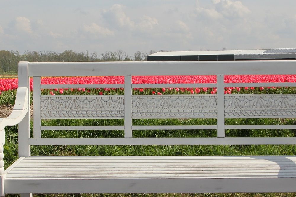Een leegstaand bankje tussen de bollenvelden in de bollenstreek. Narcissen op de voorgrond en tulpen op de achtergrond.