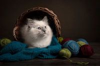 Kitten in een rieten breimand met overal bolletjes wol in een stilleven setting.