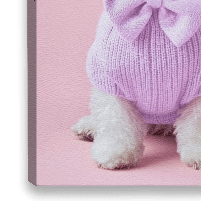 Met zijn zachte, krullende bontstrengen en schattige grote ogen betovert deze Bolognezer elke toeschouwer. In een delicate, lavendelkleurige trui met een charmante strik ziet hij er chic en schattig tegelijk uit. Zijn gestalte straalt een speelse elegantie uit die harten verovert. Een echt maatje in de beste mode!