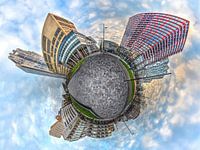 Verder met de klok meedraaiend zien we die twee blokjes die in de jaren tachtig het eerst gerealiseerde project vormen van Mecanoo, het architectenbureau van Francine Houben. Daarachter bevindt zich het Bouwcentrum en de nieuwe kantoortoren First.