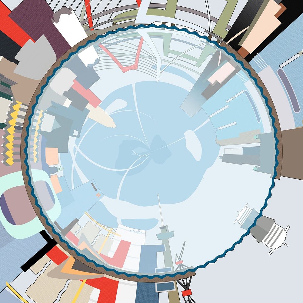 Dit bolpanorama toont de skyline van Rotterdam, gespiegeld in de levensader en bestaansreden van de stad: de Nieuwe Maas. Behalve recente aanwinsten als het Centraal Station en de Markthal zijn ook klassiekers als het Witte Huis en Hotel New York vertegenwoordigd. In deze update zijn ook de twee allernieuwste iconen, de Zalmhaventoren en het Depot van museum Boymans, toegevoegd. En naast de vier bruggen zijn ook typisch Rotterdamse verschijnselen als een haven- en een bouwkraan te zien.