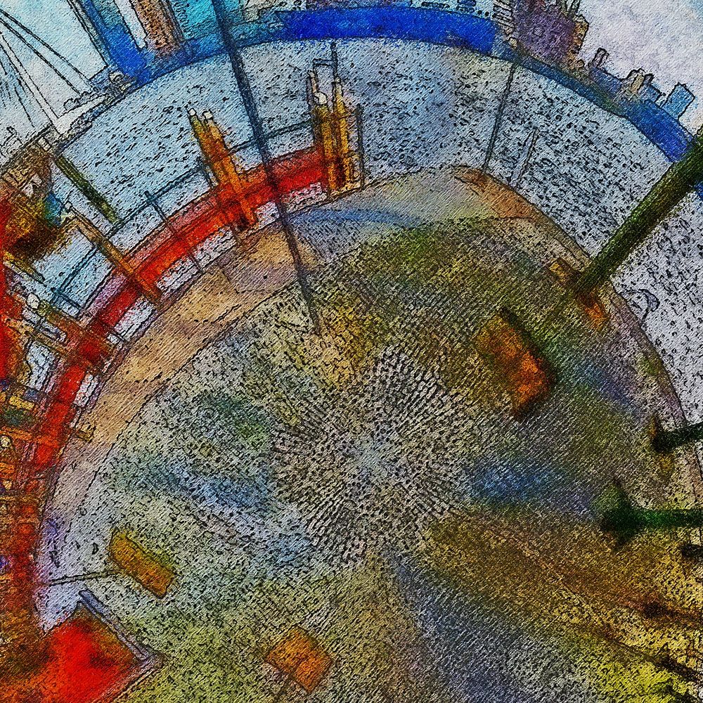 Dit beeld is gemaakt door het combineren van twaalf foto's gemaakt op de hoek van de Veerhaven en de Westerkade in Rotterdam. Het beeld is bewerkt in Photoshop om het een getekende, schilderachtige uitstraling te geven.