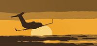 Een Bombardier CRJ - 200ER die door een vector hemel tijdens zonsondergang of zonsopkomst, met kleurrijke wolken op de achtergrond . Het vliegtuig, met een zwart silhouet, vliegt rechtstreeks naar de zon.