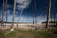 Indrukwekkende dode bomen bij zwavelbron in Yellowstone National Park USA.