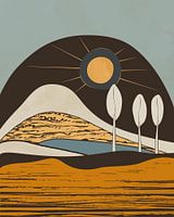 Abstract-minimalistische illustratie van drie gestileerde bomen in de opkomende zon. De kleuren zijn beperkt tot geel, orange, blauw, grijs en donkerbruin. Daardoor heeft de illustratie een rustige en vredige uitstraling.