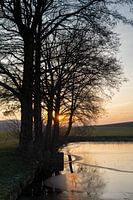 Winterse zonsondergang op een kleine vijver in Saksen. Elegante silhouetten van bomen en de kleuren van de avondlucht worden weerspiegeld op het oppervlak van het bevroren water.