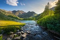 Bomen en rotsen langs de oevers van het Arpy-meer bij zonsondergang in de zomer. Morgex, Aostadal, Italië