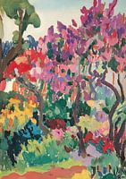 Een schilderij van bomen en struiken in de stijl van Henri Matisse, met felle kleuren, een tuintafereel, een tuin vol bloemen, bomen en planten, een tuinlandschap, een tuin met kleurrijke bloemen, een blik van achteren, een groene boom op de voorgrond, een roze bloem op de stam, een rode bloem die tot op de grond hangt, bomen en takken op de voorgrond, een paadje dat er doorheen loopt, een uitzicht op een weelderige tuin.