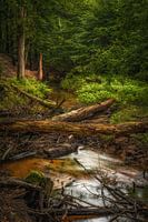 Trees and branches in 'Hierdense Brook' in the Leuvenumse Forest in the Netherlands, provide a natural flow of water in the quiet babbling brook on an early summer morning. The early light gives the forest intense colors and shades so that there is more sense of depth in the picture.