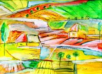 Schilderij, Fantasie, Kleurrijk, Positief, Abstract, Eigentijds, Gemengde techniek, Structuur, Spontaan, Achtergrond, Sfeer, Naïef, Intens, Kantoor, Individueel, Expressief, Velden, Wonen, Moderne kunst, Landschap, Decoratief, Decoratie, Spiralen, Grafisch, Aquarel, Modern, Groen, Geel, Blauw, Rood, Zwart, Tuin, Natuurlijk landschap