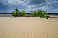 Sfeervolle landschapsfoto van twee kleine bomen in het Nationaal Park de Loonse en Drunense Duinen, die uitkijken uit over de zandvlakte.