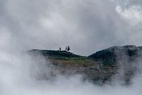 Vanaf een van de hoogste bergen van het Portugese eiland Madeira, heb je een prachtig uitzicht over de omgeving. Soms wordt die omgeving in nevelen gehuld als de wolken zorgen voor mist op de andere toppen. Hier zijn een aantal bomen gehuld in de waterdruppels op grote hoogte.