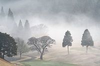 Een vroege ochtend met mist in het dal bij de vulkaan Aso in Kyushu, Japan. Foto genomen vanuit ons hotel op een golfbaan niet ver van de vulkaan.