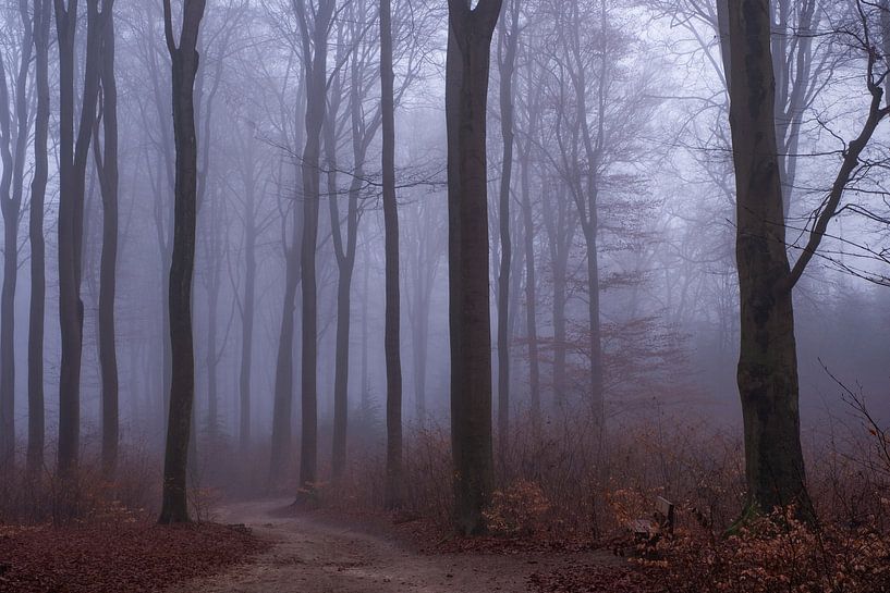 Door de mist krijgen het bos met de hoge bomen een kalme, sprookjesachtige bijna verstilde sfeer.