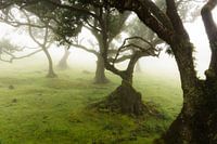 Sprookjesachtig landschap met bomen in de mist op Madeira, Portugal. Laurierbomen in het bos dat een groot deel van het eiland bedekt.