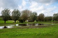 Deze bomen reflecteren in de typische plassen van een weiland rond Lennik, Pajottenland, België